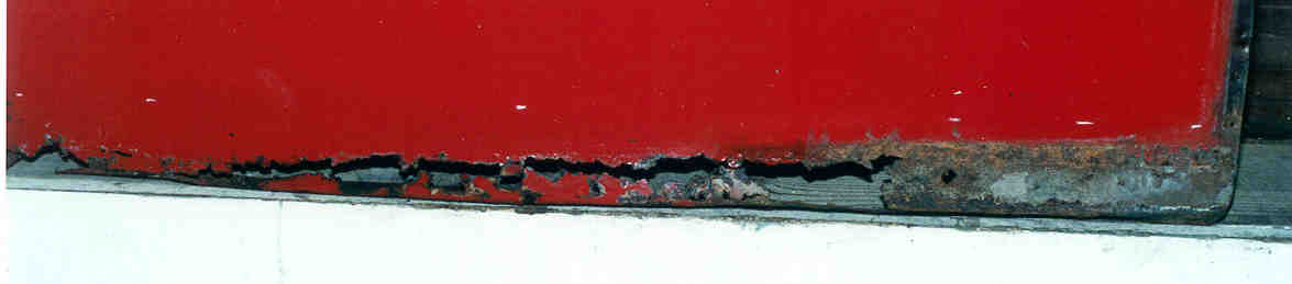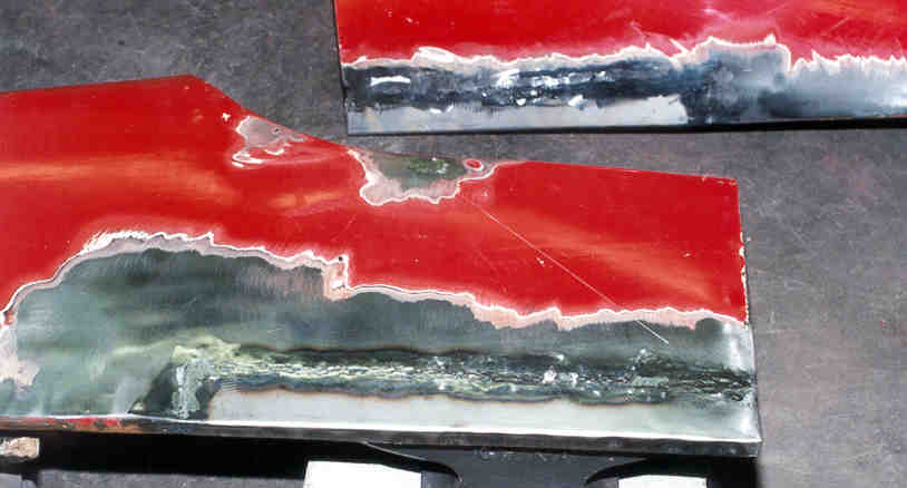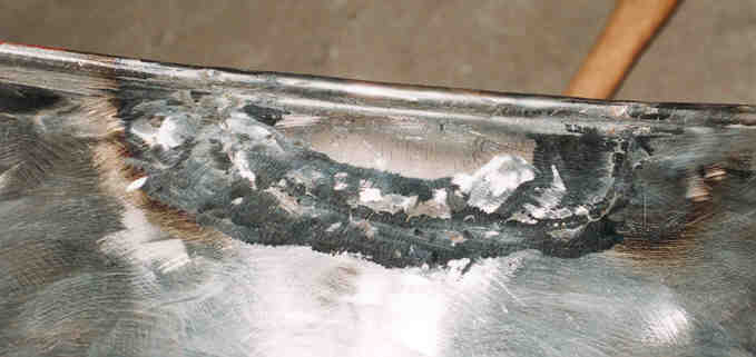 The wire bead along the bottom of the tail had apparently broken and been repaired by brazing a piece of sheet metal around it. The whole mess was covered with lots of bondo.