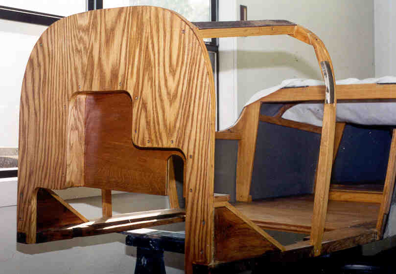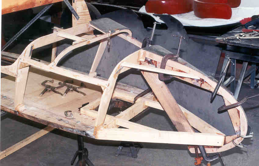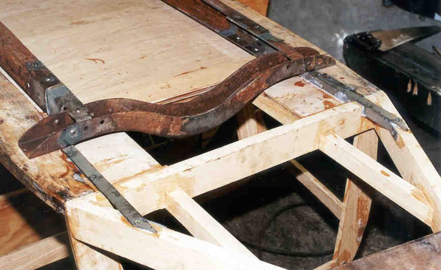 Click on any photo to enlarge, then use your "Back" button to get back to this page Restoration of the main body required patching the sheet metal and rebuilding the wood frame. The body was made primarily from three pieces of sheet metal attached to the wood frame. Many of the original sheet metal joints were drive type slip joints. These slip joints were not attached to the wood, so I replaced them with flanges and screws into the wood frame. Originally, the frame was probably built first and the sheet metal fitted to it. However, for a restoration I had to build the frame to fit the sheet metal. This was not easy and required much test fitting. It seemed like the sheet metal never fit exactly the same from one test fit to the next. My plan was to save as much of the original wood as possible. After inspection, I realized that the only pieces I could save were the main tail piece and the sills (see tear down). The original design was so weak that I felt compelled to make the rebuild stronger. A friend that builds sail boats put me on to a really nice epoxy system from West Marine. This stuff is really nice, especially if your carpentry skills are not the greatest. I decided to reconstruct the body from the tail forward. This shows the sills after repair and cleanup and my reengineering of the tail. Now it is all braced and tied together.