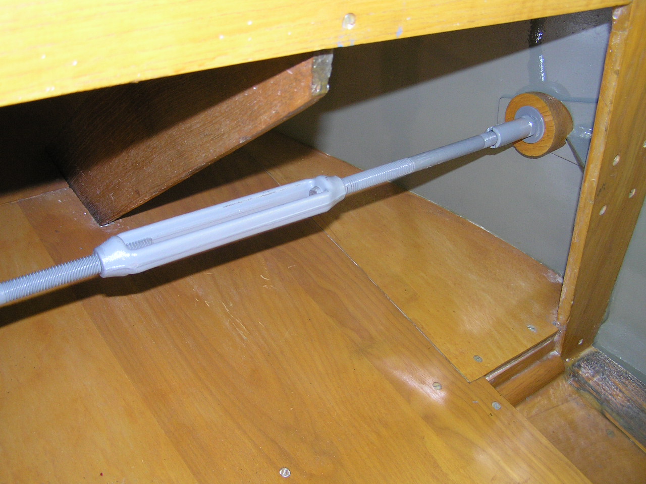 This shows the turnbuckle and rods I've been talking about. Originally, the holes on the two sides were misaligned by about an inch and a half. Fortunately, I discovered this early on and fixed it.