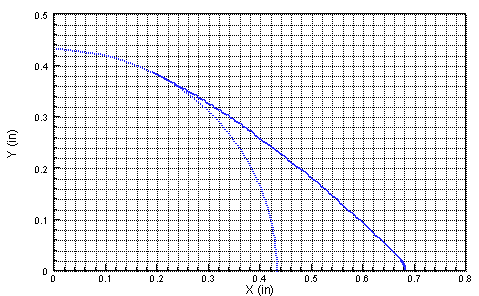 Design of Improved Stock CamAs discussed in the preceding sections, the stock Model T cam has relatively high ramp velocity and requires a valve lash of 0.025 to produce the specified duration of 218 degrees. Consequently, the actual lift is only 0.225. The first cam is designed with stock lift and stock duration, but with a valve lash 0.010 and ramp velocity less than that of a stock T cam. Some pertinent parameters for this design are listed in Table 3. The lift, velocity and acceleration curves are compared to those of a stock cam in Fig. 6, while the lobe shape is presented in Fig. 7. To compensate for the different valve lash between the two cams, 0.015 is subtracted from the lift on the stock cam in Fig. 6. This adjustment is not made in Table 3, so in order to compare the duration at a given actual lift, 0.015 must be subtracted from the lift values in Table 2 (see Stock Cam). Compare the values for stock and improved stock cams in Fig. 6 and Tables 2 and 3. The ramp velocity for improved stock cam is equivalent to that for a stock cam running with a valve lash of 0.011 and much less than a stock cam running with a standard lash of 0.025. Due to the smaller ramp velocity, the lift initially increases more gradually. To compensate for this difference, the seat-to-seat duration was made slightly larger than stock to minimize the differences between the lift curves for lifts less than 0.050. Note that the improved cam has duration at lifts between 0.013 and 0.042 that is slightly less than stock. Due to the smaller ramp velocity and higher lift, the improved stock cam must have a larger acceleration rate than the stock cam. However, the maximum acceleration rate of 0.00055 should not pose any problem. The value of Rb + Lmax = 0.682, so this cam should slide easily through the holes in the block. Since the maximum velocity is 0.0079 (lifter contact radius of 0.450 inches), the cam will run on stock lifters. With its low ramp velocity, near stock duration and actual lift slightly greater than stock, this improved stock cam should be very well behaved, have excellent low-end power and torque, and peak power that is slightly higher than stock.