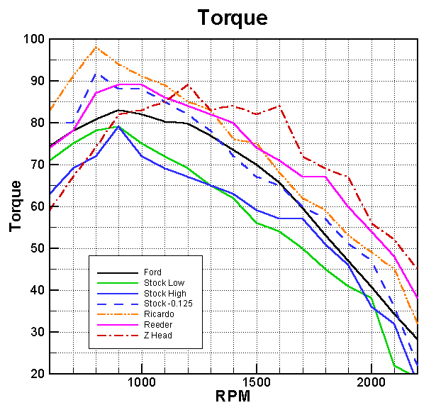 Tom Carnegie has recently tested several Model T heads on an engine dynamometer. The results of these tests are shown in the figures below. Performance curves for the 1918 tests made by Ford Motor Company (black lines labeled "Ford") are included for comparison. These results indicate that the Waukesha-Ricardo head has the best low end performance, while the Z head has the best performance at higher RPM. In fact, a Z head was found to be no better than a stock head below 900 RPM. These results conflict with our own experience.
