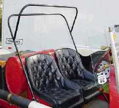 The framework is made of half-inch electrical conduit. The primary requirement was that the complete top, including frame, could be dismantled and placed in a bag on the floor in front of the seat. It takes about 5 minutes to install this top and side curtains. The bends were made with a common electrical conduit bender. The slip joints required steel tubing slightly smaller than the conduit so it would locktite into one side and slip fit into the other. Some fitting was required. The lathe or drill press can be used to file this tubing to fit. This same smaller tubing was also pushed inside the lower 15 inches of the main sidepieces to provide additional strength. The side sockets were fabricated from cast iron pipe tees cut off and brazed to steel plates and bolted to the seat with 4 stove bolts. All frame parts including the socket are bead blasted and powder coated glossy black. Another consideration is headroom or how high the passengers sit in the seat. When making the frame I brought Lavina to the shop put her in the seat and measured the height and told her a divorce was imminent cause she was too tall! After that my memory is blurred.