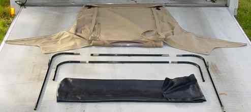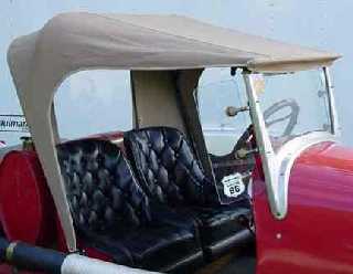 The cover material is probably the most expensive you can buy, the good news is that it doesn’t take very much and it’s well worth it. The material is called Sta-proof, tan on tan, which means it’s tan on both the inside and outside. It never stains. This top has been used thru several rainstorms, and as you can see it’s none the worse for wear. It has a roll-up rear curtain with a classic oval glass design. . The top is attached to a front wood bow which thumbscrews rigidly to the round knobs on top the Morton and Brett windshield. Much of the strength of this design is in the top cover primarily the main straps. These straps are stapled solidly to the front bow and attach with a common sense fastener to the top to the seat back. The top cover also attaches in a similar manner with several fasteners to the top edge of the seat.