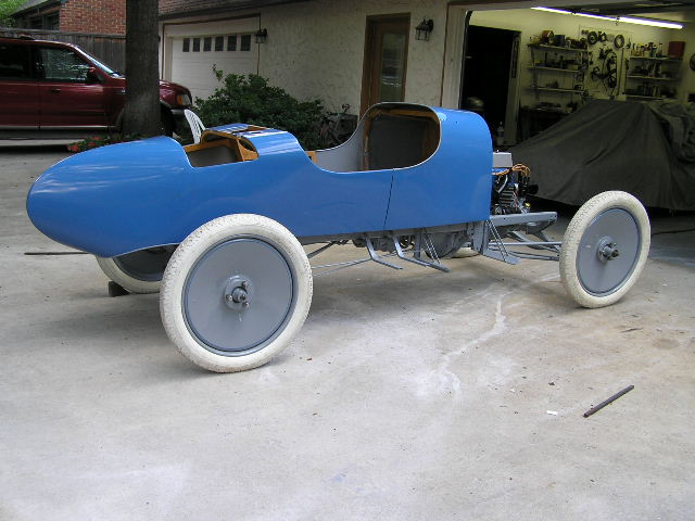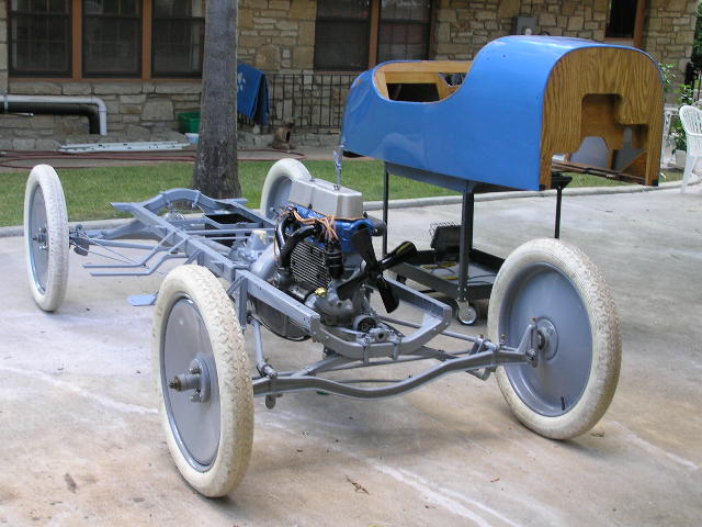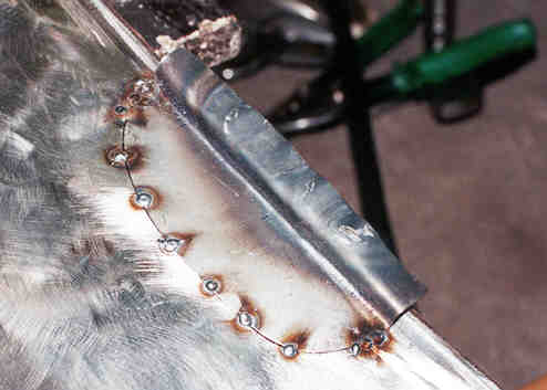 Click on any photo to enlarge, then use your "Back" button to get back to this page The first step in the body restoration was patching of the sheet metal. The body is made of three pieces of sheet metal plus a small trapezoidal piece on the rear deck. The body was rusted out at the bottom from the firewall to the seat back, so patches were welded along the bottom of the cowl and the bottom front portion of the tail sections. The worst area along lower part of the cowl