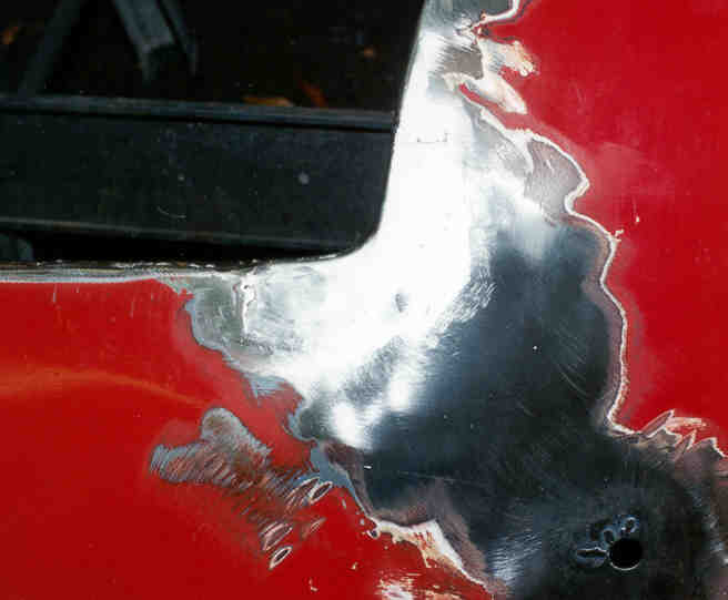 The wire bead along the bottom of the tail had apparently broken and been repaired by brazing a piece of sheet metal around it. The whole mess was covered with lots of bondo.
