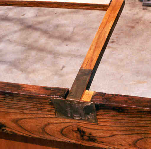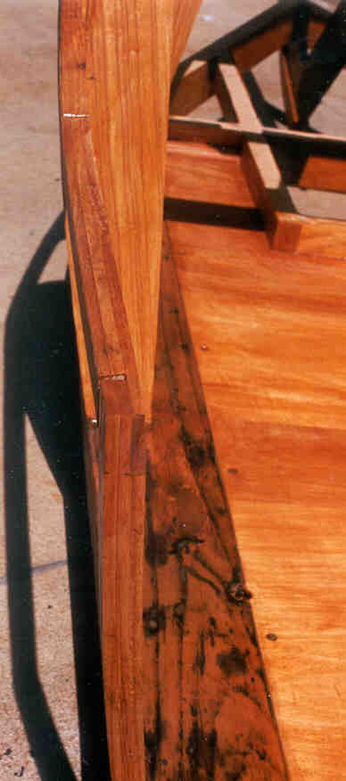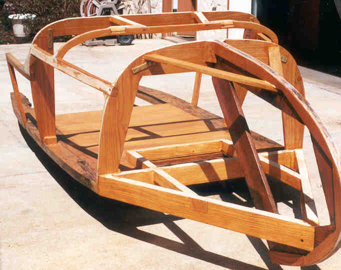 Click on any photo to enlarge, then use your "Back" button to get back to this page Restoration of the main body required patching the sheet metal and rebuilding the wood frame. The body was made primarily from three pieces of sheet metal attached to the wood frame. Many of the original sheet metal joints were drive type slip joints. These slip joints were not attached to the wood, so I replaced them with flanges and screws into the wood frame. Originally, the frame was probably built first and the sheet metal fitted to it. However, for a restoration I had to build the frame to fit the sheet metal. This was not easy and required much test fitting. It seemed like the sheet metal never fit exactly the same from one test fit to the next. My plan was to save as much of the original wood as possible. After inspection, I realized that the only pieces I could save were the main tail piece and the sills (see tear down). The original design was so weak that I felt compelled to make the rebuild stronger. A friend that builds sail boats put me on to a really nice epoxy system from West Marine. This stuff is really nice, especially if your carpentry skills are not the greatest. I decided to reconstruct the body from the tail forward. This shows the sills after repair and cleanup and my reengineering of the tail. Now it is all braced and tied together.