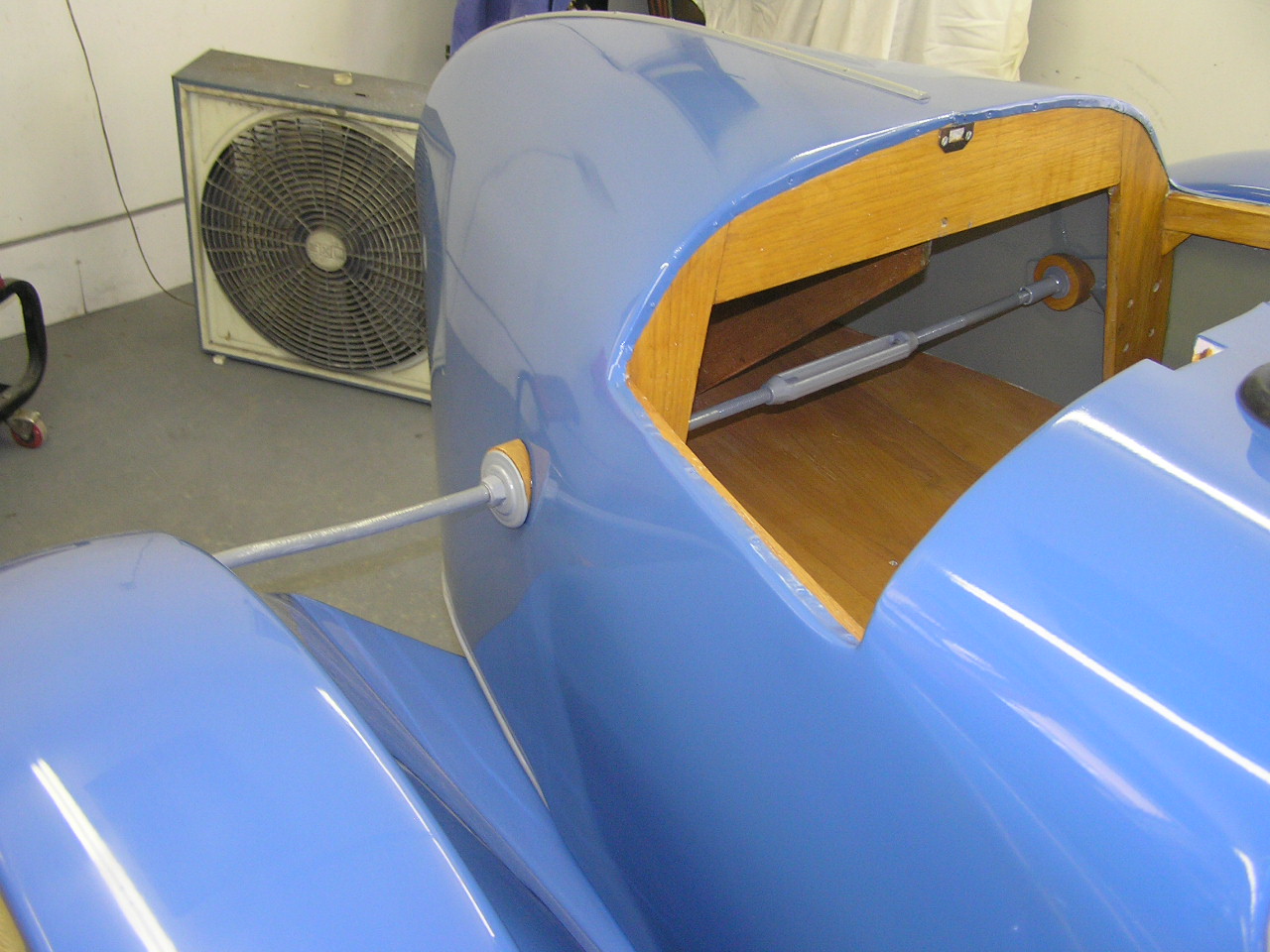 Click on any photo to enlarge, then use your "Back" button to get back to this page We are now ready for final assembly. This shows the final mounting of the body on the frame and installation of all the peripheral components. This is the fun part. I think I see a light at the end of the tunnel. I had a couple of friends come over to do the final mounting of the body, because it is difficult with the crazy turnbuckle arrangement to support the rear fenders.