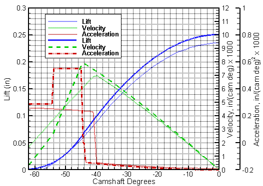 Figure 6. Comparison of improved stock (thick lines) and stock cams