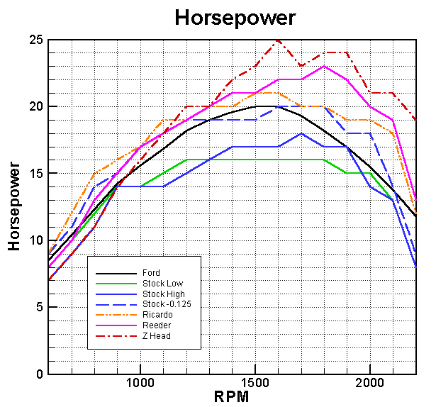 Tom Carnegie has recently tested several Model T heads on an engine dynamometer. The results of these tests are shown in the figures below. Performance curves for the 1918 tests made by Ford Motor Company (black lines labeled "Ford") are included for comparison. These results indicate that the Waukesha-Ricardo head has the best low end performance, while the Z head has the best performance at higher RPM. In fact, a Z head was found to be no better than a stock head below 900 RPM. These results conflict with our own experience.