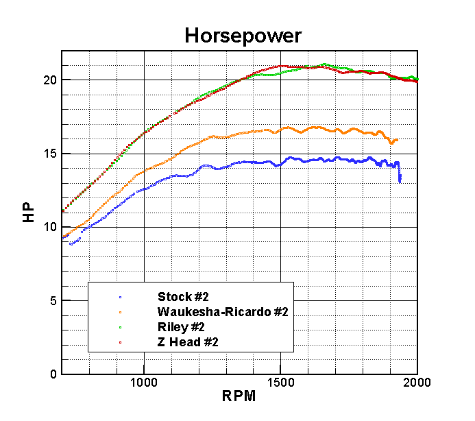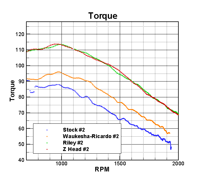 The power and torque values are shown in the graphs below. The results tend to correlate with the compression ratio of the head. As one would expect, increased compression gives improved power and torque for all engine speeds. Compared to the stock head, the Waukesha-Ricardo head produces a 14 percent increase in peak power and a 9 percent increase in peak torque. The performance of the Riley and Z heads are virtually identical. Each produces about a 42 percent increase in peak power and a 30 percent increase in peak torque. These results are consistent with our previous dynamometer results, where we found that the Z head produced 45 percent greater horsepower and 33 percent more torque.