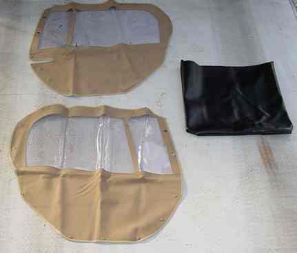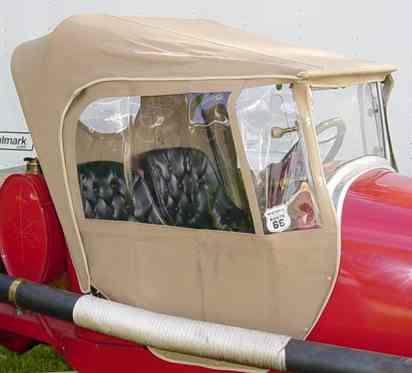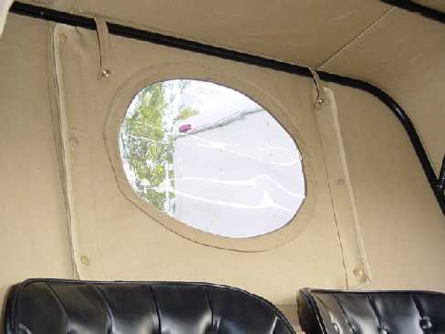 The side curtains are made of the same material as the top with large windows for good visibility. These side curtains are folded and carried in a small bag in the trunk. Notice they snap on all the way around to the inside of the top and to the body on the bottom. I used snaps but if you prefer for authenticity, common sense fasteners could be used. Notice how well the curtains and top fit around the windshield. We were in a wind and rainstorm with 40 mph winds and stayed perfectly dry inside! We were pleasantly surprised.