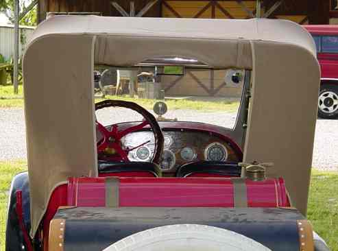 The cover material is probably the most expensive you can buy, the good news is that it doesn’t take very much and it’s well worth it. The material is called Sta-proof, tan on tan, which means it’s tan on both the inside and outside. It never stains. This top has been used thru several rainstorms, and as you can see it’s none the worse for wear. It has a roll-up rear curtain with a classic oval glass design. . The top is attached to a front wood bow which thumbscrews rigidly to the round knobs on top the Morton and Brett windshield. Much of the strength of this design is in the top cover primarily the main straps. These straps are stapled solidly to the front bow and attach with a common sense fastener to the top to the seat back. The top cover also attaches in a similar manner with several fasteners to the top edge of the seat.